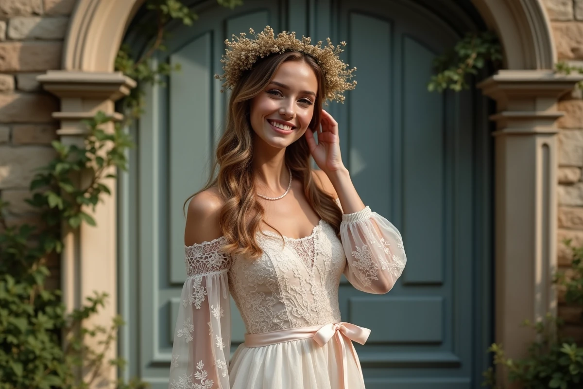 - Les silhouettes élancées gagnent à choisir une robe longue fluide à taille haute, mise en valeur par une ceinture tressée ou une bande de dentelle. Cette coupe élance, tout en rappelant une élégance naturelle. Les manches bouffantes ou volantées ajoutent une touche de mouvement, sans alourdir.